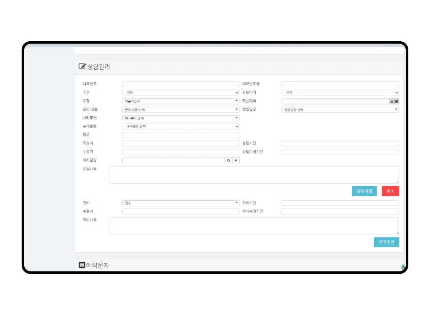 신규 고객 문의가 들어오면, 고객관리에서 고객등록 후 상담관리에서 고객의 정보를 알맞게 작성합니다.