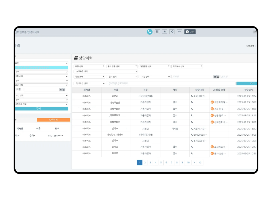 기존고객(재문의)의 경우 고객에게 전화 수신 시 고객데이터를 실시간으로 확인하면서 상담내용을 즉시 기록 가능한 자동등록과 상담내용을 실시간으로 기록하지 못할 상황일 때 고객검색 후 직접 기록이 가능한 수동기록으로 구분하여 편의에 맞게 고객관리가 가능해요!