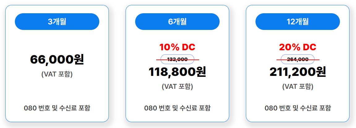 또한 080번호 제공 뿐만 아니라 수신료까지 포함되고 있어 처음 결제되는 건 외에 추가적인 비용이 발생하지 않아요.