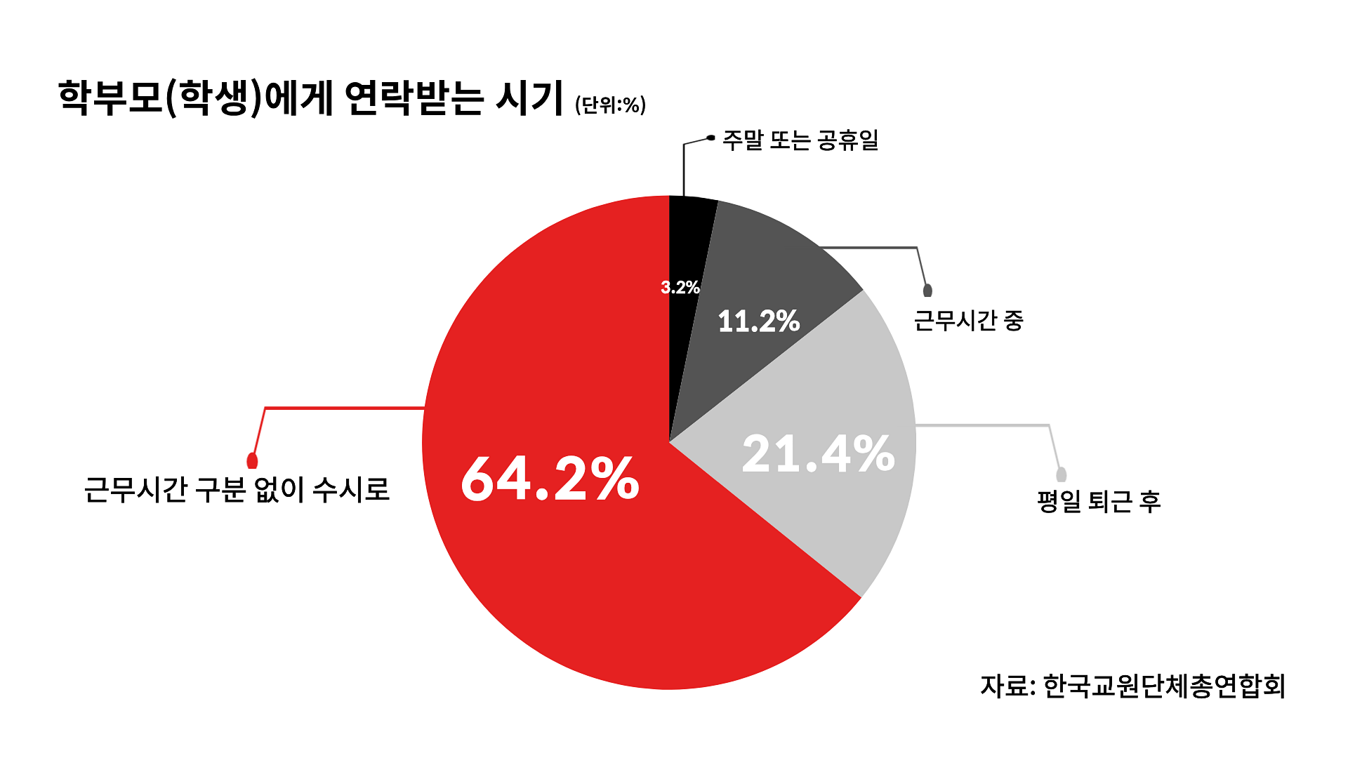 한국교원단체 총 연합회의 조사 자료를 보면 대부분의 선생님들이 근무시간 구분 없이 수시로 학부모나 학생에게 연락을 받고 주말, 공휴일, 퇴근 후에 연락을 받는 경우도 아주 많아요.