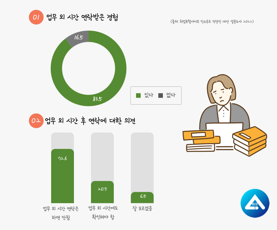 실제로 한 설문조사에 따르면 대한민국 직장인 중 83.5%가 퇴근 후, 휴가 중, 업무 외 시간에 연락을 받은 경험이 있다고 답했어요.