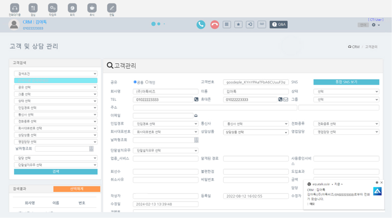 아톡비즈 솔루션 연동을 통해 고객 전화 인입 시, 고객 정보·이력과 상담 내역이 자동 팝업으로 뜨기 때문에 별도의 검색 없이 빠른 상담이 가능합니다.