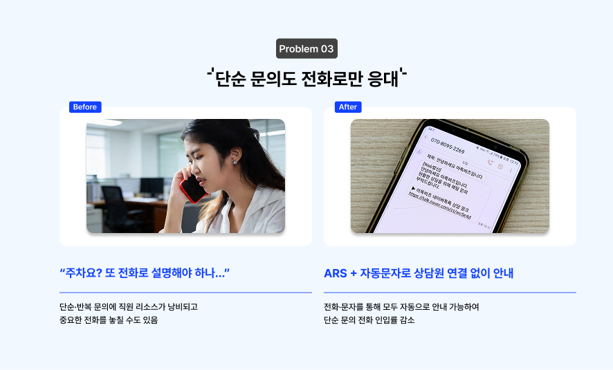 답변이 어렵지 않은 문의인데도, 전화를 직접 받아야만 안내가 가능한 구조라면 이것도 꽤 귀찮은 업무가 됩니다. 같은 말을 하루에 열 번씩 반복하다 보면 중요한 상담 전화를 놓치기도 하고, 직원 피로도도 쌓이게 돼요.