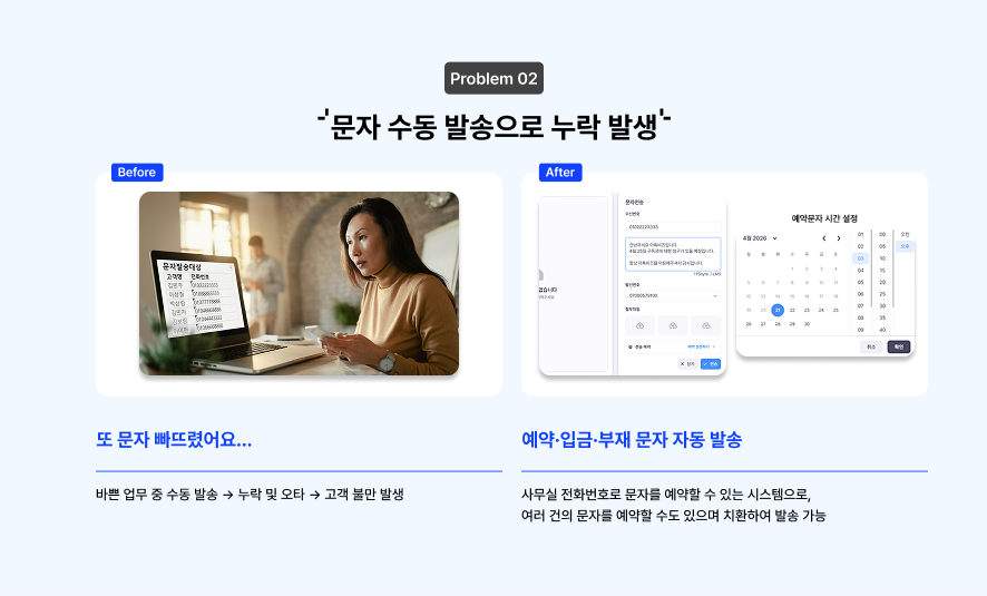 그러면서도 정작 신경 써야 하는 중요한 상담은 놓치고, 문자 발송은 깜빡하고, 통화 이력은 나중에 기억을 더듬어가며 억지로 적게 됩니다.