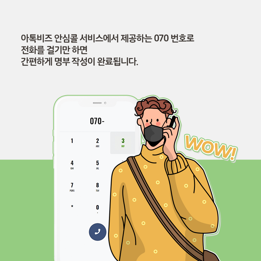 전화를 거는 것만으로도 안심할 수 없다면 문자 전송 시스템도 함께 이용해보세요. 전화 시 송출되는 ARS 자동 멘트 이후 문자가 발송되므로 문자 인증을 필요로 하는 곳에서 유용하게 사용할 수 있습니다. 개인정보 노출 걱정 없는 아톡비즈 안심콜 서비스는 4주 후에 자동으로 개인정보가 폐기되므로 안심하고 사용이 가능합니다.