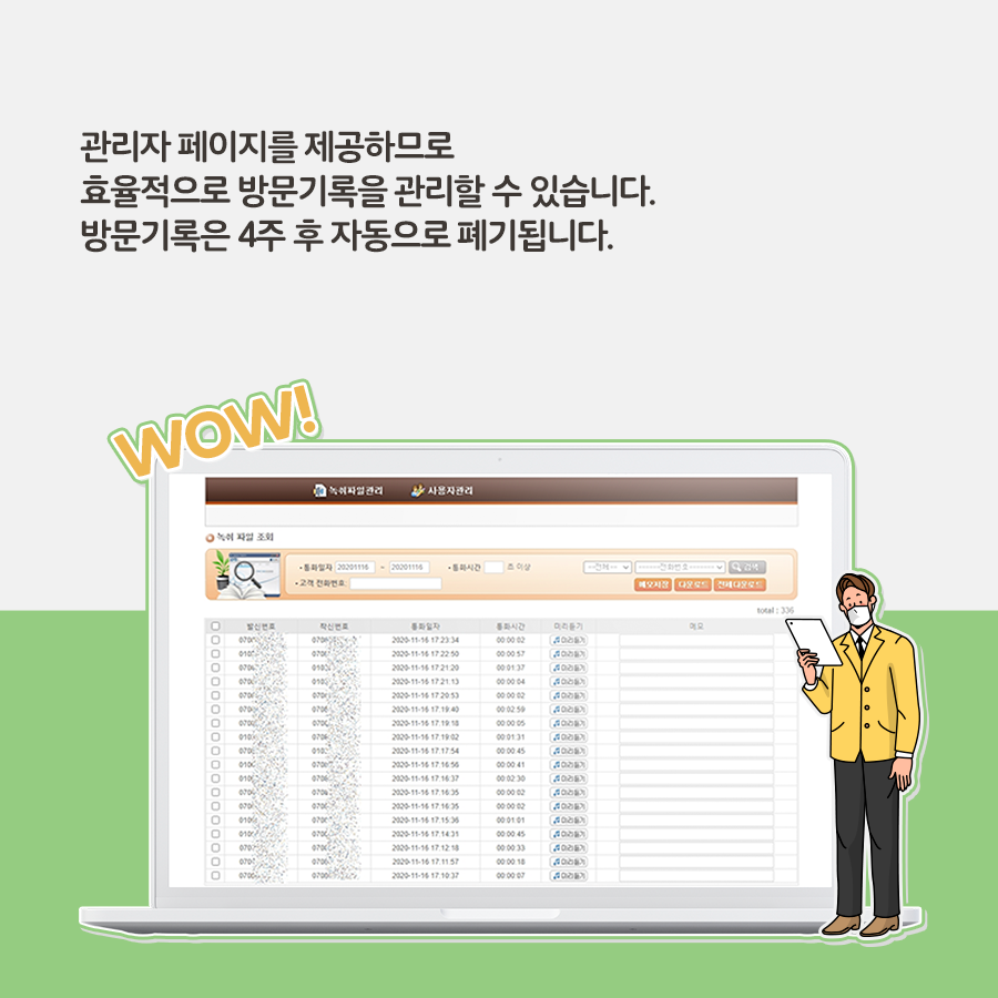 코로나19의 국내 총 확진자 수가 4만 명이 넘어가면서 각종 기관이나 식당, 건물 출입 시 출입명부의 중요성이 확대되고 있습니다. 그러나 현재 보편적으로 많이 사용하고 있는 QR코드는 사용법이 복잡하고, 손으로 작성하는 수기 명부는 필기체이기 때문에 알아보기 힘들다는 단점이 있습니다. 아톡비즈 안심콜 서비스에서는 복잡한 인증절차 없이 간단하게 전화 한 통 걸면 인증이 쉽게 완료되기 때문에 편리하게 출입명부를 작성하실 수 있습니다. 아톡비즈 안심콜에서 제공되는 관리자 페이지로 출입명부를 간편하게 관리해보세요.