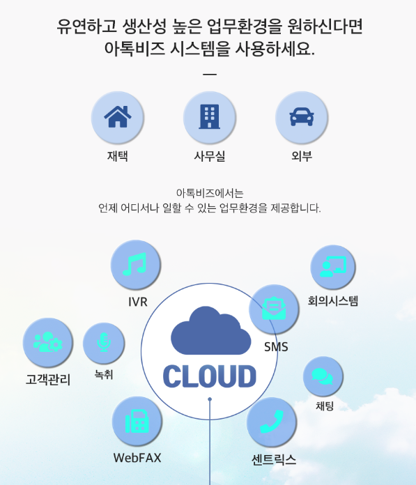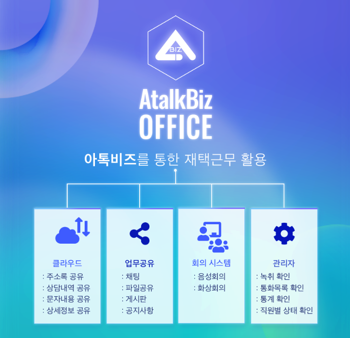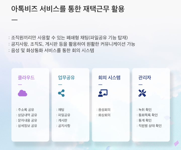 이톡비즈로 이용할 수 있는 다양한 기업 맞춤형 서비스는 굳이 사무실 컴퓨터가 아니더라도 언제 어디서나 업무를 볼 수 있도록 구축되어 있습니다. 외근이 잦거나 전화 상담을 많이 하는 분들, 그리고 재택근무를 해야 하는 분들은 아톡비즈 오피스를 통해 재택근무 솔루션을 이용해보세요.