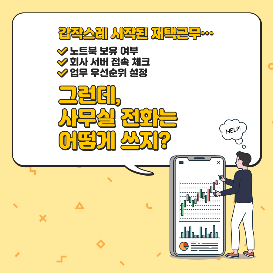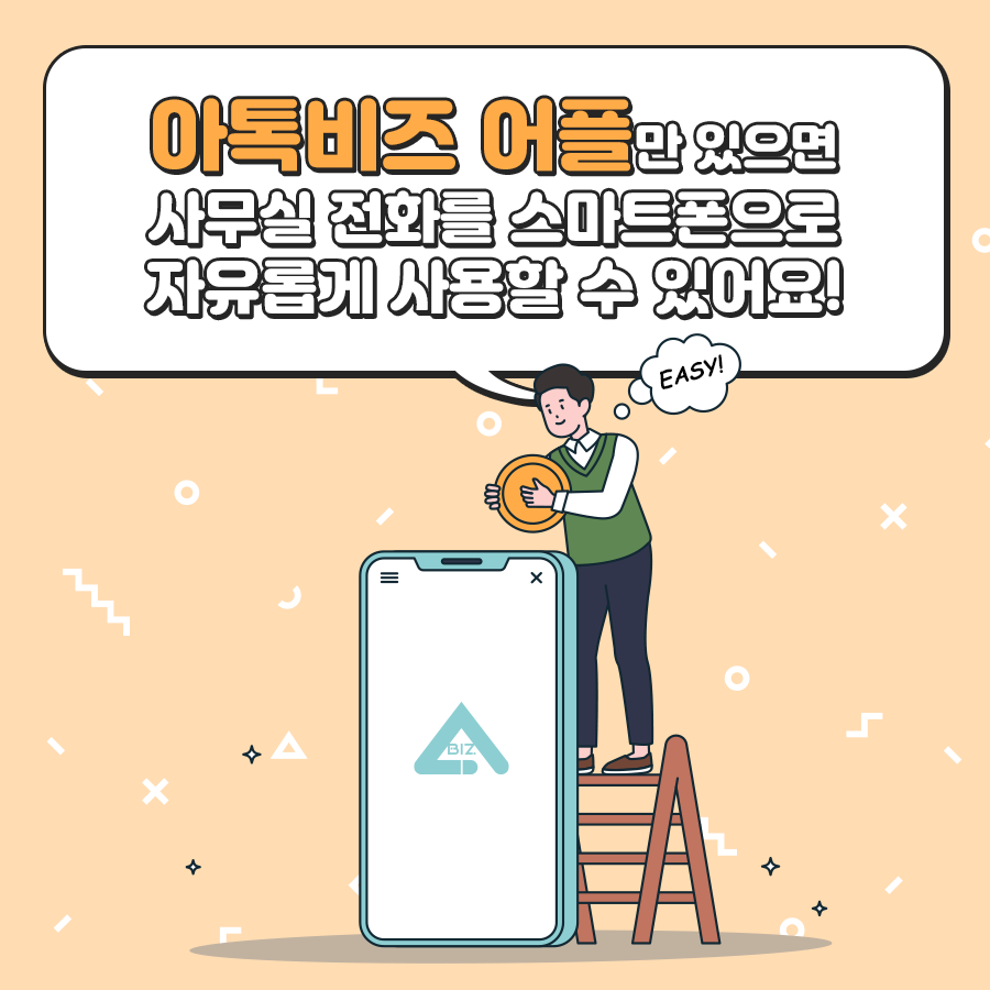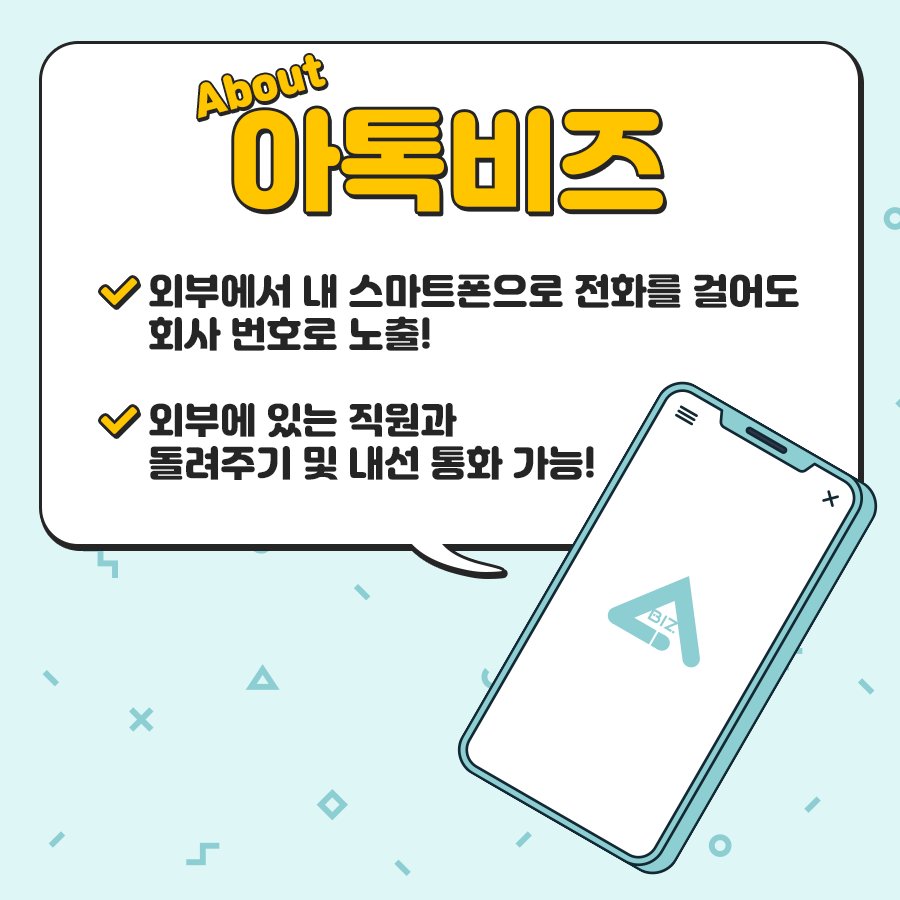 재택근무 시 사무실 전화, 어떻게 사용하고 계시나요? 아톡비즈는 사무실 전화 기능을 스마트폰으로 사용할 수 있는 서비스를 제공합니다. 착신전환 없이 내 핸드폰으로 언제 어디서나 내선통화, 돌려주기, 당겨 받기 등의 기능을 사용하실 수 있습니다. 아톡비즈를 통해 전화 발신 시 회사 번호로 노출이 되며, 조직도와 채팅, 주소록, 공지사항 등의 기본적인 협업 기능이 탑재되어있어 효율적인 업무 진행이 가능합니다.