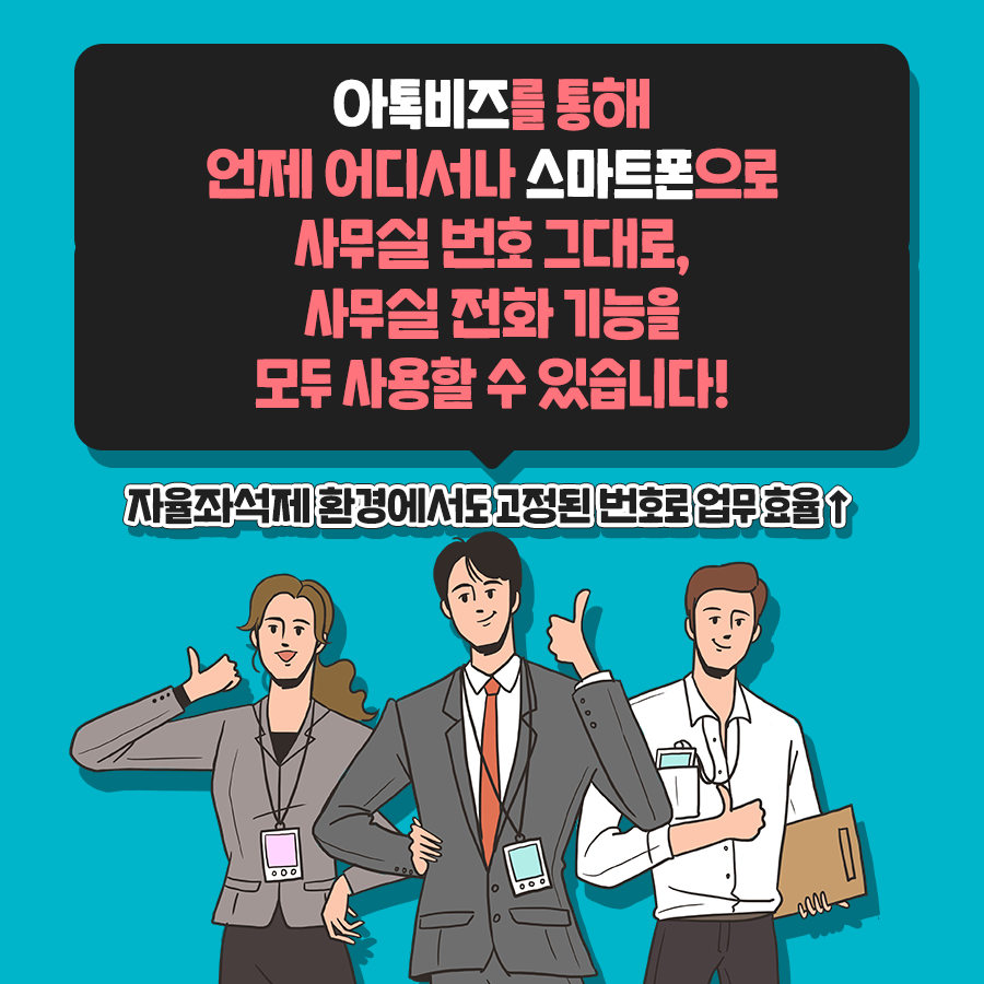 아톡비즈는 언제 어디에서나 자유로운 사무실 소통 환경을 완벽하게 구축하는 전문 서비스입니다.