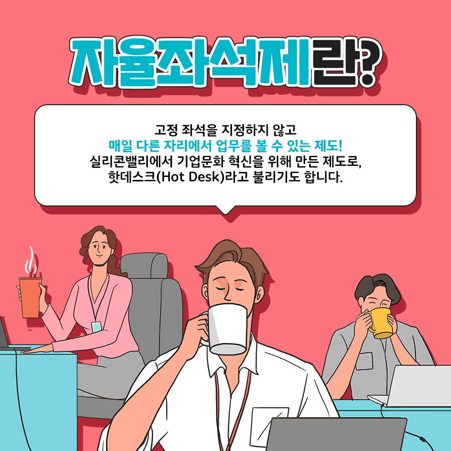 직급, 직책에 따라 고정 좌석을 지정하지 않고 매일 다른 자리를 선택하여 업무를 진행할 수 있는 제도.