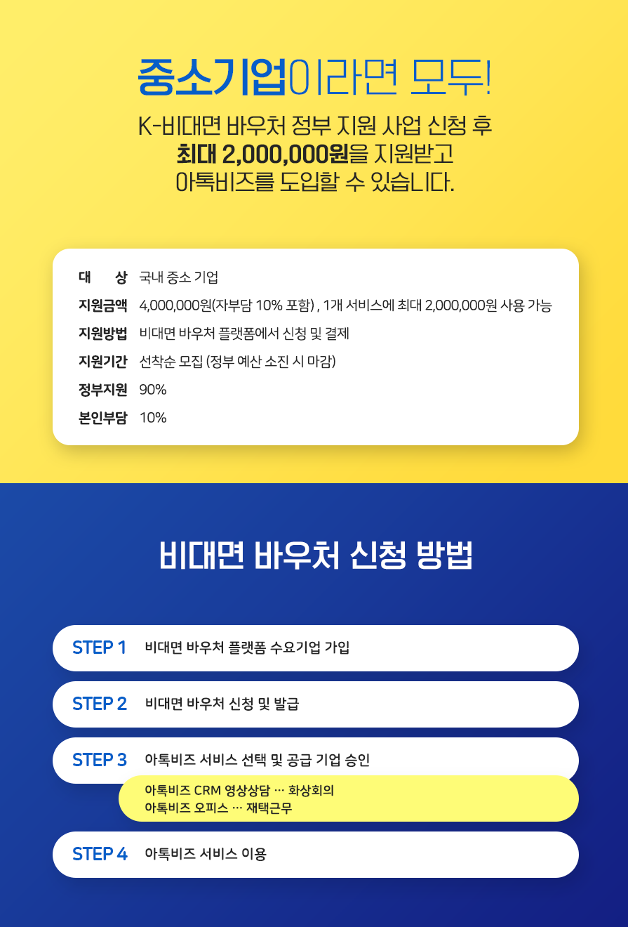 안녕하세요. 기업과 고객을 잇는 업무 솔루션을 제공하는 <아톡비즈>입니다. 아톡비즈가 K-비대면바우처플랫폼에 공급기업으로 최종 선정되어 90%의 정부지원금, 10%의 자부담만으로 아톡비즈 서비스를 제공해드릴 수 있게 되었습니다 :)