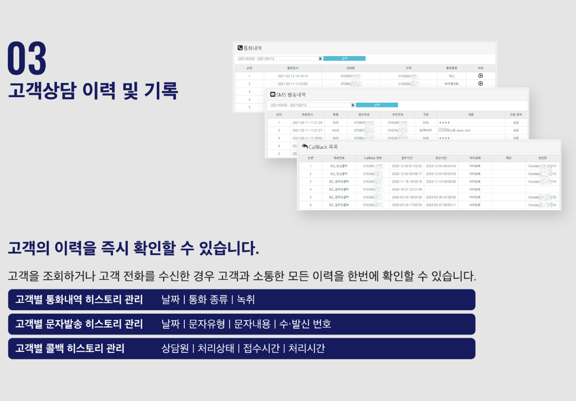 또한, 고객에게 수신이 오거나 조회를 하였을 경우 고객과 있었던 히스토리를 바로 확인할 수 있도록 한 페이지 내에서 표시합니다.(통화, 녹취, 콜백, 문자, 상담 이력)