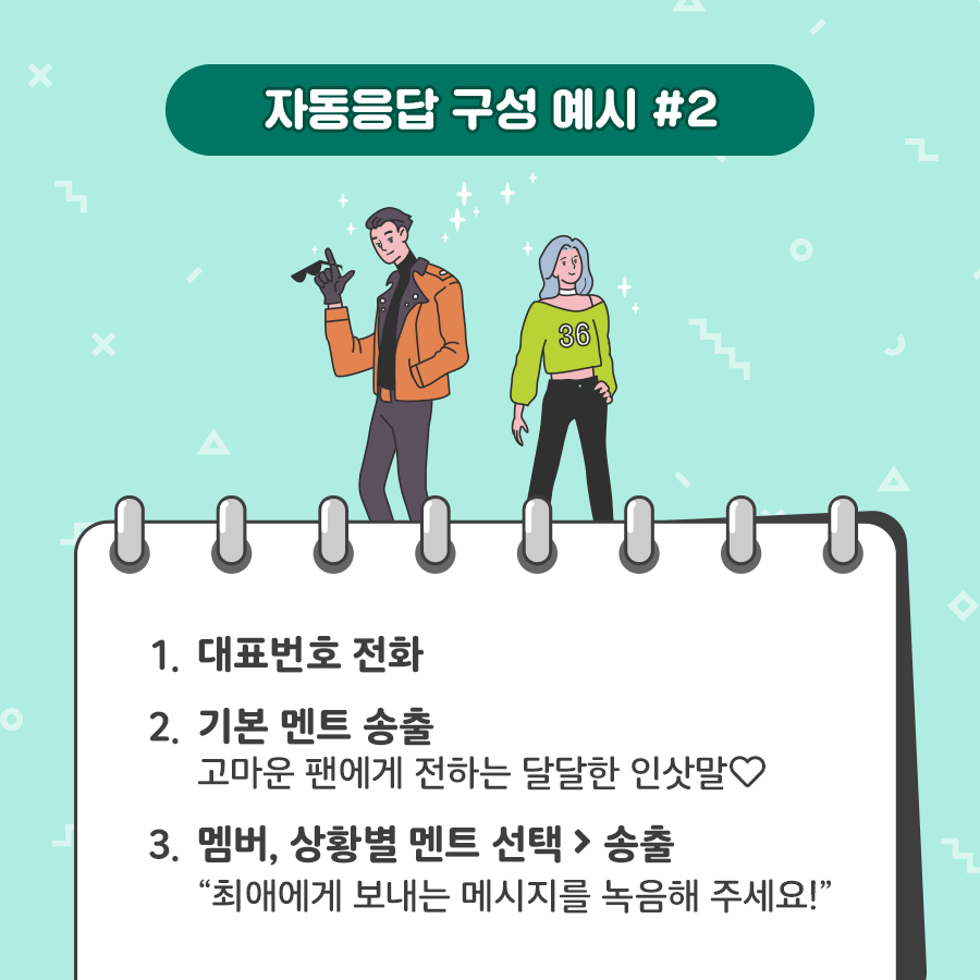 팬이 미리 공지된 대표 번호로 전화를 걸면, 팬과의 소통/ 컴백 스포/ 신곡 선공개 등의 준비된 멘트가 송출됩니다. 여러 멤버가 있을 시 멤버별, 상황별 멘트를 선택 가능하고 선택된 멘트에 맞는 음원이 송출되고 통화를 종료하는 구성입니다.