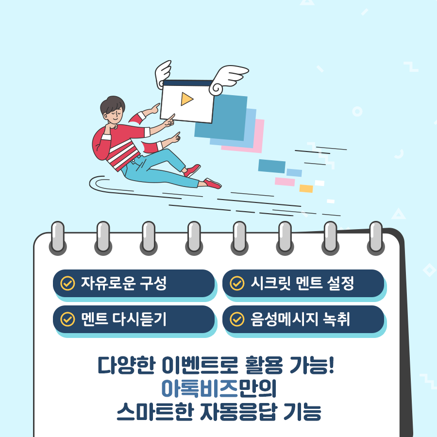 아톡비즈 자동응답기능은 원하는 시나리오와 업체 별 특성에 맞는 자유로운 구성이 가능합니다. 표면적인 음성 멘트로 송출되지 않는 메뉴를 설정 할 수 있어 재밌는 이벤트에 활용 가능하며, 멘트 다시 듣기 기능, 음성메시지 녹취까지 다양한 기능을 제공하고 있습니다.