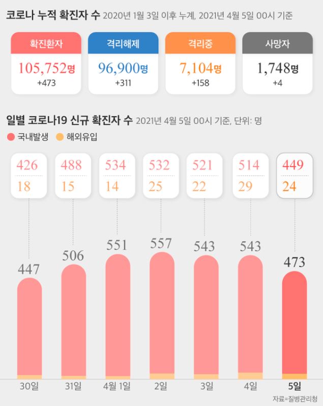 4월 5일 0시 기준, 코로나19 신규 확진자수 473명을 기록했습니다. 일주일간 447명 → 506명 → 551명 → 557명 → 543명 →543명 → 473명으로 6일만에 400명대로 내려왔지만, 주말 검사건수가 줄어든 영향으로 보입니다.
