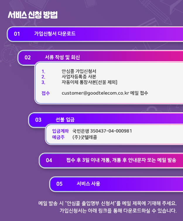 * 필요 서류 : 안심콜 가입 신청서, 사업자등록증 사본, 자동이체 통장 사본(선불은 제외입니다.)