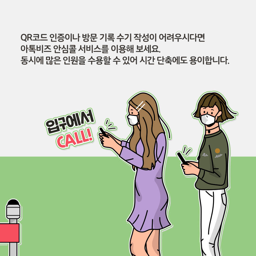 초 단위로 명부가 기록되기 때문에 동시에 많은 인원이 전화를 걸어도 출입 인증을 할 수 있는데요. 안심콜 출입관리시스템을 도입하기 전에는 수기출입명부이던, QR체크인 전자출입명부이던 줄을 서서 기다려야 합니다. 간단하게 전화 한 통으로 명부를 작성하는 안심콜을 도입하면 빠르게 출입 인증이 가능하며, 방문자 리스트를 통해 꼼꼼한 방역 관리를 할 수 있습니다.