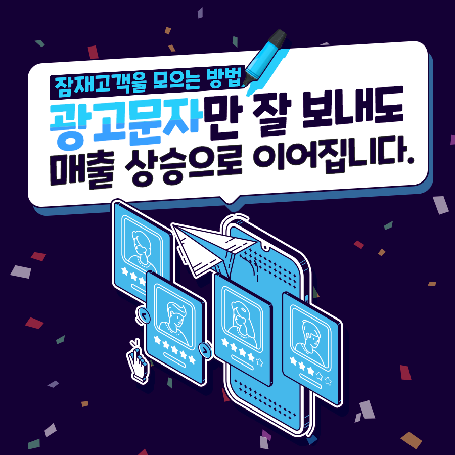 접근성이 좋은 문자를 광고 수단으로 이용할 때는 고객의 입장을 생각하여 대량의 홍보성 문자보다는 소소한 이벤트, 쿠폰으로 잠재고객을 모으는 것이 좋습니다. 또한 매장을 방문한 고객들에게 감사 문자를 남기는 것도 고객들의 기억에 남을 수 있는 방법이겠죠?