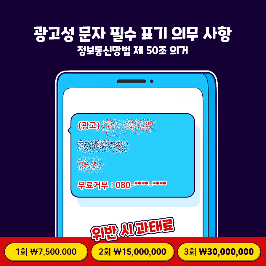 위 내용의 정보통신망법 제 50조 위반 시, 3천만원 이하의 과태료가 발생합니다. 광고 문자를 전송할 때는 필수 표기 사항 및 080무료수신거부 번호를 꼭 기재해야겠죠?