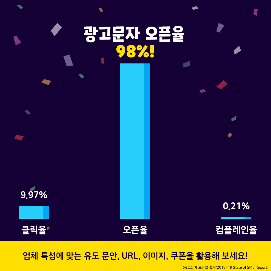 항상 휴대폰을 들고 다니며 확인하는 현대인들은 SNS 이용율뿐만 아니라 문자 오픈율도 높았습니다. 광고 문자의 오픈율은 98%로 대부분의 사람들에게 쉽게 접근할 수 있습니다. 98% 중 9.97%는 광고 문자를 직접 클릭하며 URL에 접속하거나 이미지, 쿠폰을 눈여겨 보는데요.