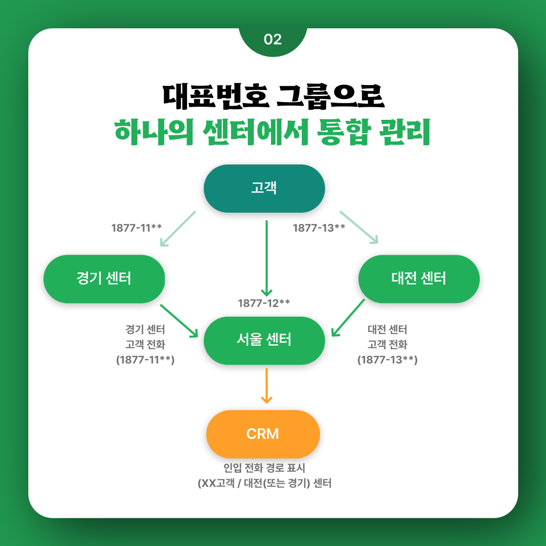 만약 고객이 대전에 있는 곳으로 전화를 했을 경우 서울에서 전화를 받을 수 있으며 CRM에서 '대전 XX센터'로 경로를 확인할 수 있습니다 :)
