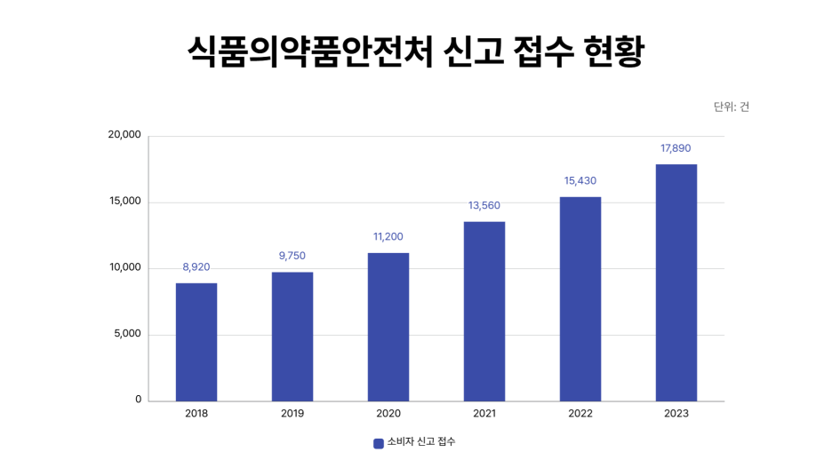 식품의약품안전처에 따르면 2020년 이후 식품 클레임이 급증하였으며 2023년까지 연평균 12~15%씩 지속적으로 증가하고 있는 추세입니다. 코로나19로 인해 온라인 식품 구매가 증가하면서 품질 불만이 늘어났고 이후에도 이물 혼입(머리카락, 플라스틱 조각 등) 및 표시 오류(유통기한, 원산지 등)의 원인으로 신고를 접수한 내용이 높게 나타났습니다.